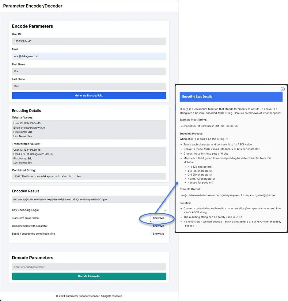 Overview This web application is a utility for an internal team to share their plans to encode and decode URL parameters securely. It is specifically designed for handling user information in web applications.
